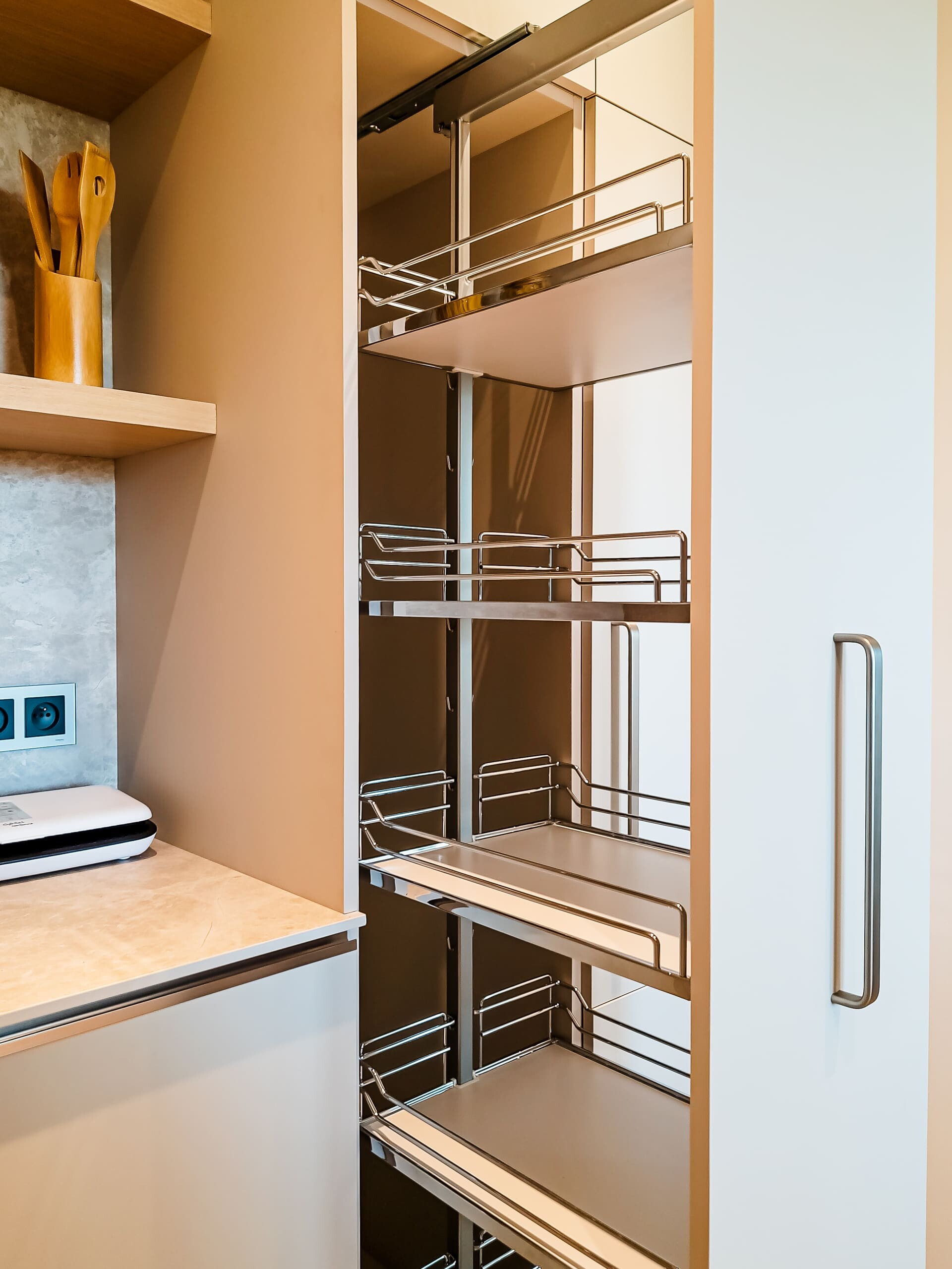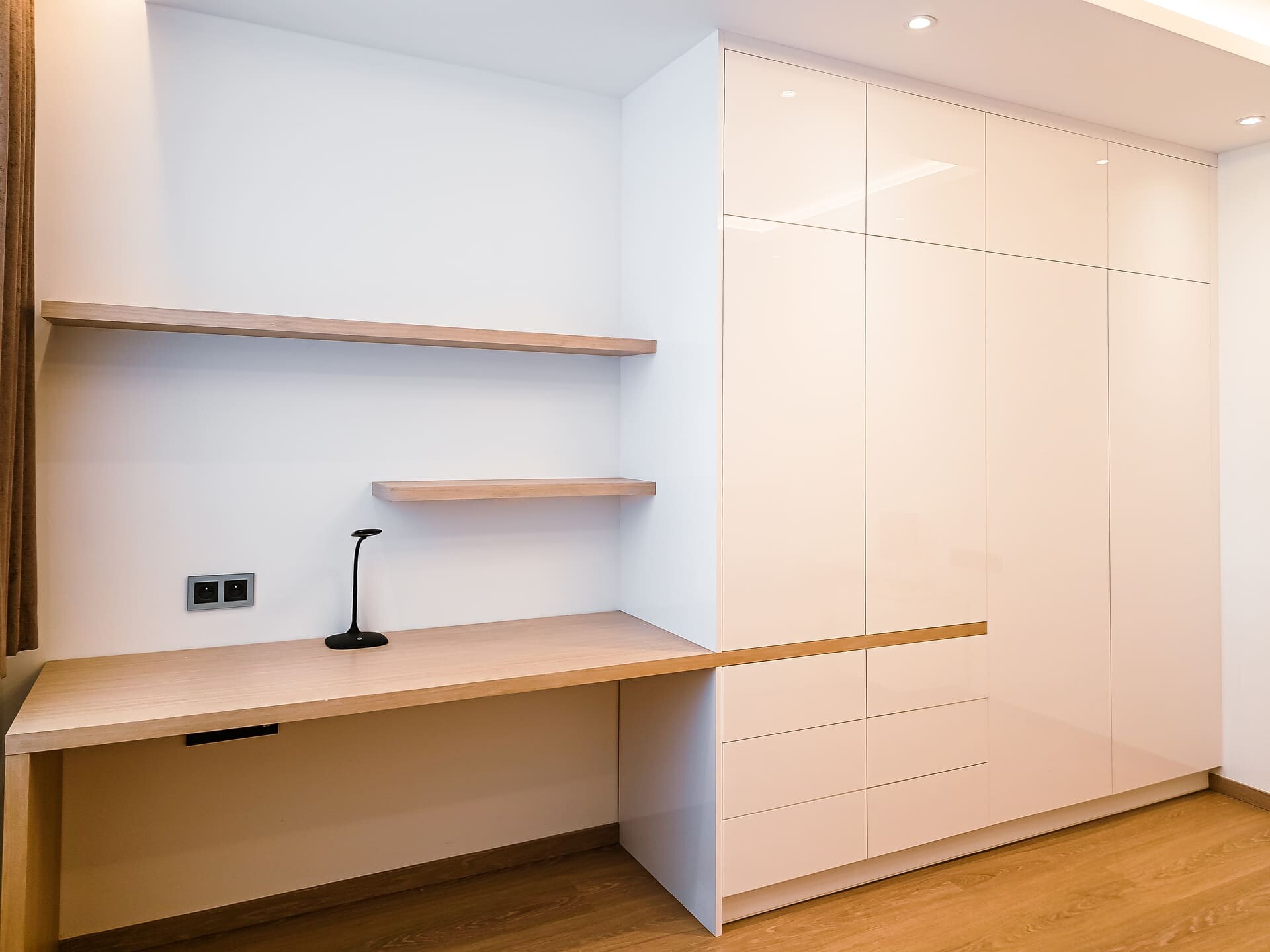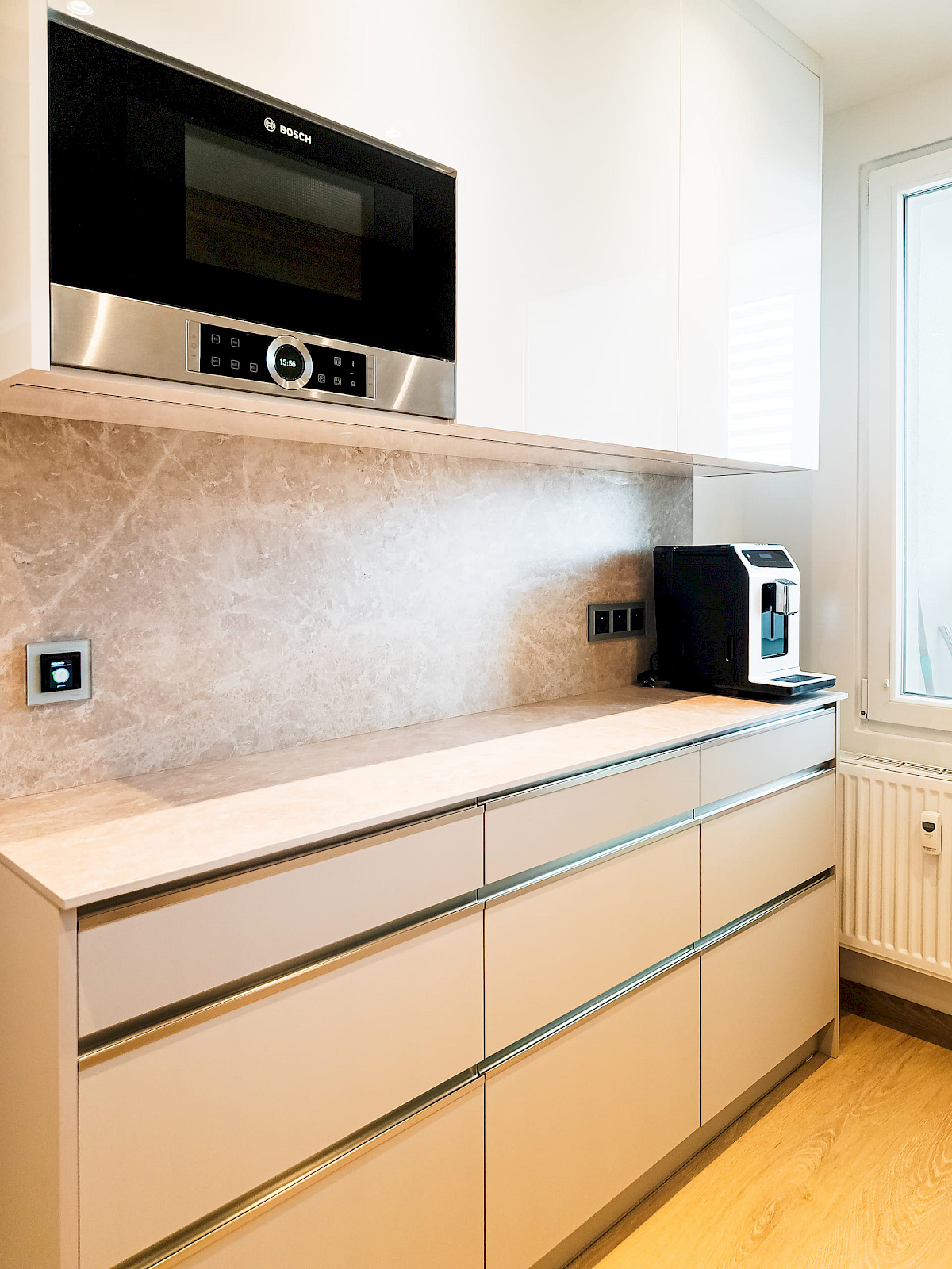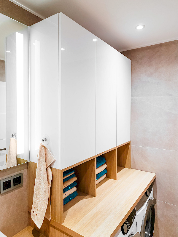 Pro tento byt v Komíně jsme zvolili moderní a elegantní design, ve kterém se snoubí nadčasová bílá barva s přírodními materiály. Otevřené police, které se nacházejí v kuchyni i dalších místnostech, pak dodávají celému prostoru vzdušnost a lehkost. Úložný prostor pak doplňují praktické skříňky rozličných tvarů a velikostí.