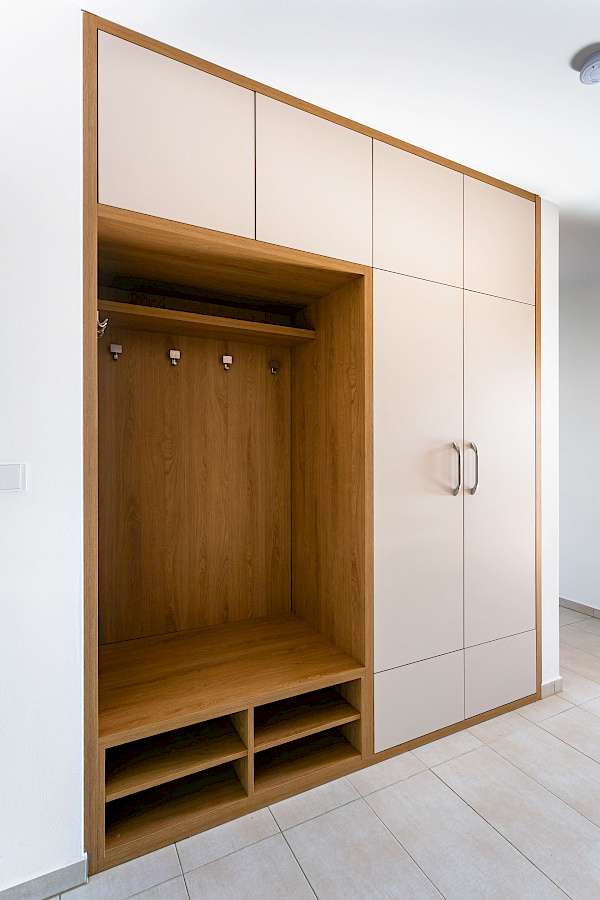 Pro byt v Roztokách jsme volili materiály tak, aby sjednocovaly jednotlivé místnosti a aby byt působil kompaktním a příjemným dojmem. Kuchyně v odstínu Perfect Matt Alpská bílá od firmy Egger slibuje odolnost vůči otiskům prstů a odpovídá představám majitele o praktickém řešení kuchyně. Pro ozvláštnění byla bílá doplněna také šedými dvířky a nerezovými úchytkami.