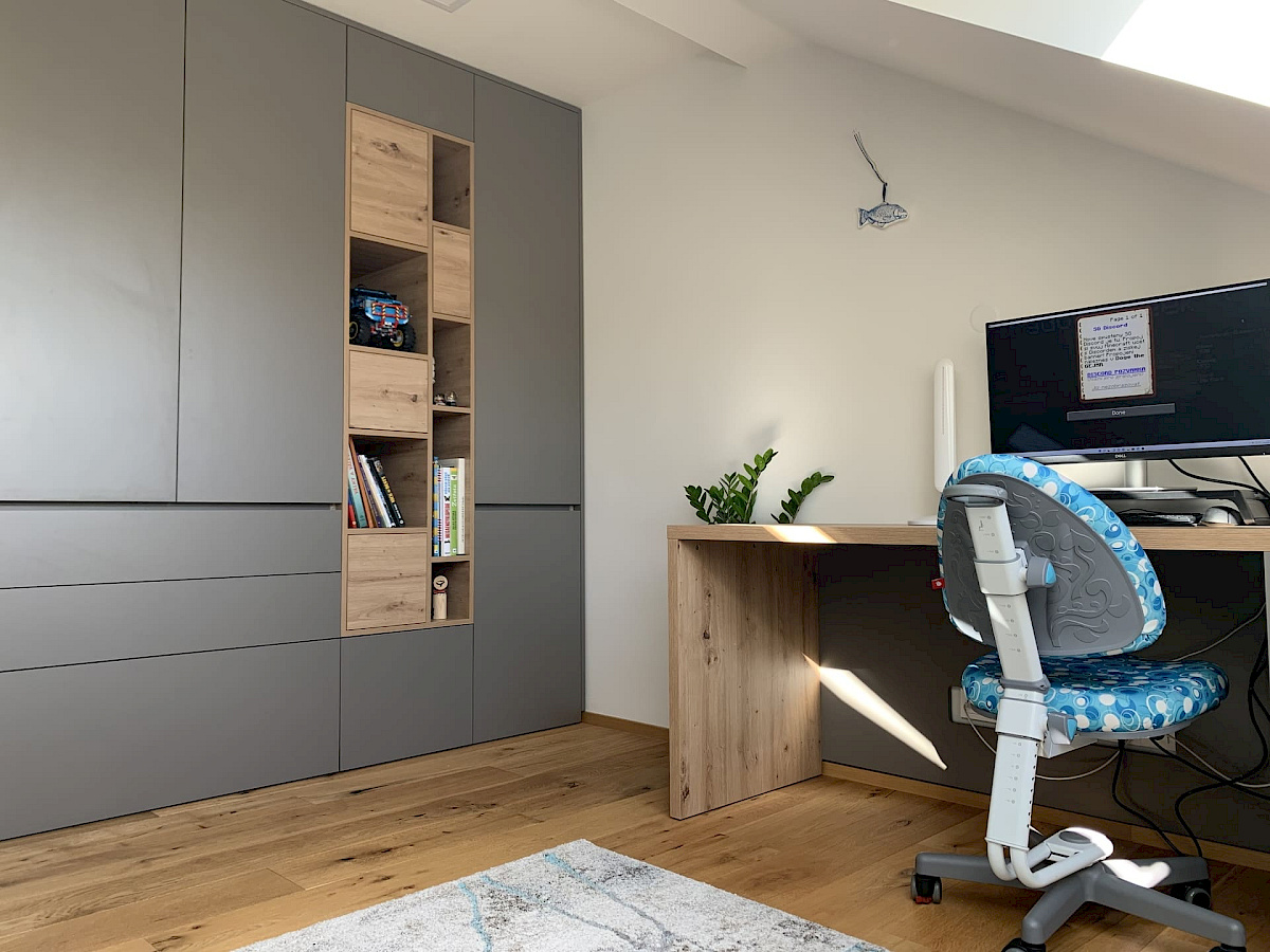 Pro mladou rozrůstající se rodinu jsme realizovali dva dětské, chlapecké pokojíčky. Podkrovní prostory většinou umožňují vymyšlení netradičních řešení interiéru a dobrým plánováním lze i v prostorově omezenějších podmínkách získat dostatek místa a úložných prostor. Zejména výroba nábytku na míru poskytuje možnosti realizovat skříně a stoly pod šikminou, jako tomu bylo i v tomto případě. Po konzultaci dispozic a návrhů s majitelkou byl jako základní materiál zvolen přírodní dub Hamilton, ke kterému krásně ladí kožené úchytky skříní. Barevně byl kombinován s bílými a šedými dvířky.