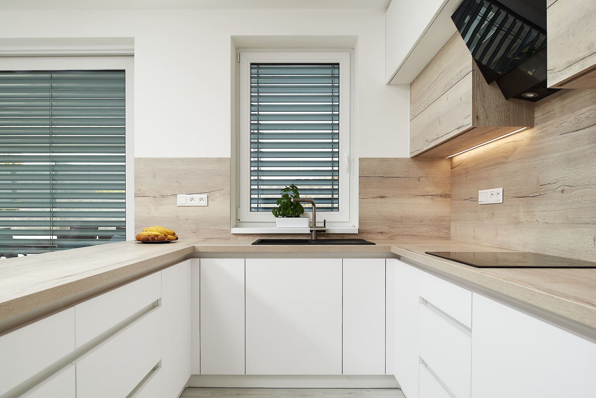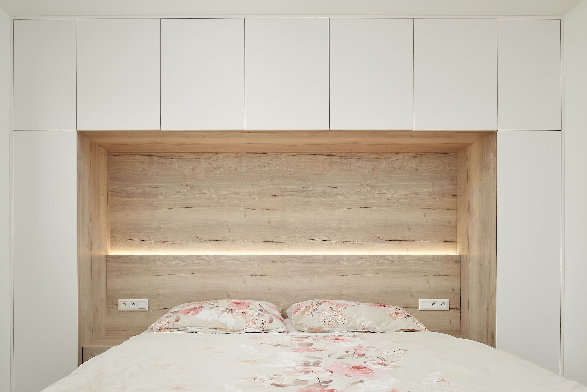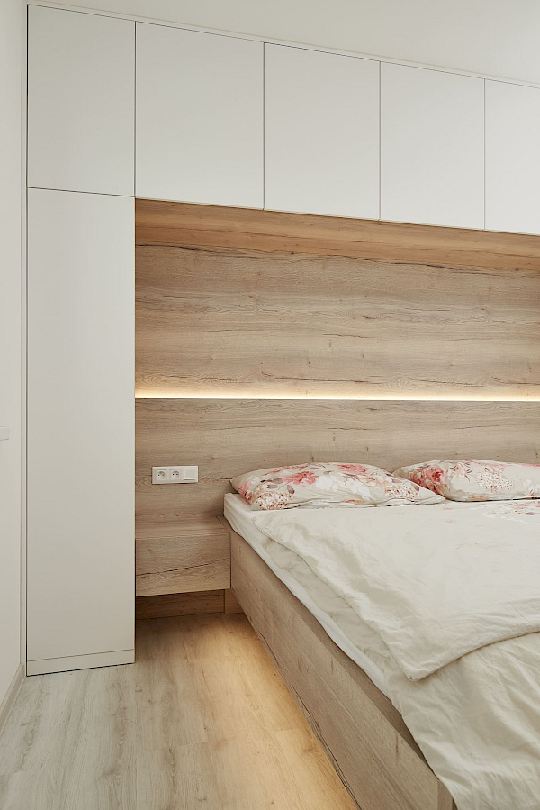 Velmi pohodlným a funkčním řešením může být kuchyňská linka v půdorysu písmene U. Toto navržení kuchyně poskytuje dostatek úložných prostor pro nádobí i spotřebiče a zároveň dostatek pracovní plochy pro jednoho i více lidí najednou. Díky svému rozvržení je v takové kuchyni vše po ruce a s výběrem správných dekorů je výsledný dojem velmi útulný. Pro kuchyň v Bučovicích jsme zvolili oblíbenou kombinaci Alpské bílé od firmy Egger a dřevodekoru, který je zde zastoupen bílým dubem Halifax z kolekce Feelwood. Jedná se o dekor, který krásně vyniká svou prořezávanou strukturou a působí dojmem opravdového dřeva. I proto byl tento dekor zvolen jako jednotící prvek celého bytového interiéru také pro nábytek v předsíni i ložnici, které panuje krásná podsvětlená postel s pohybovým čidlem.