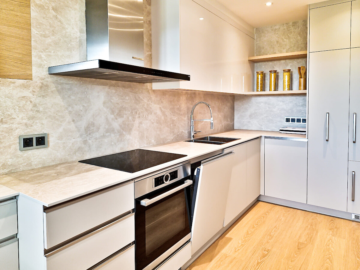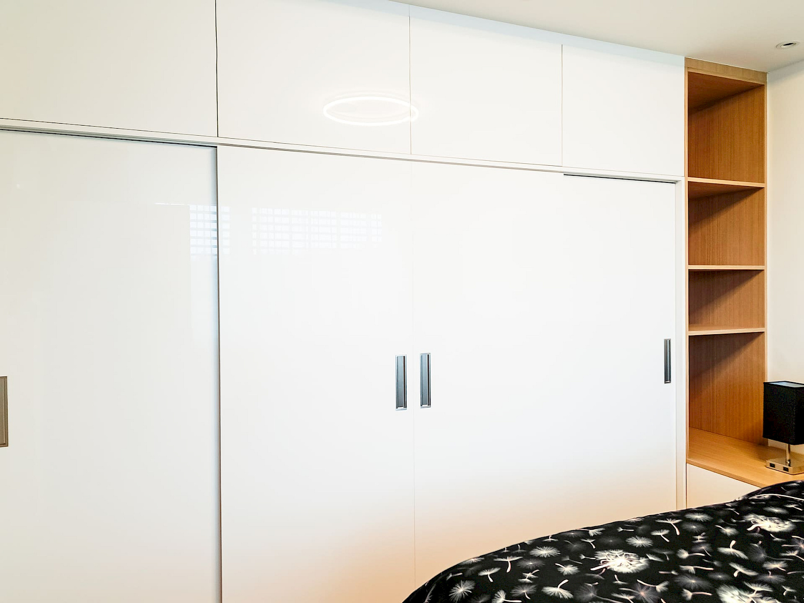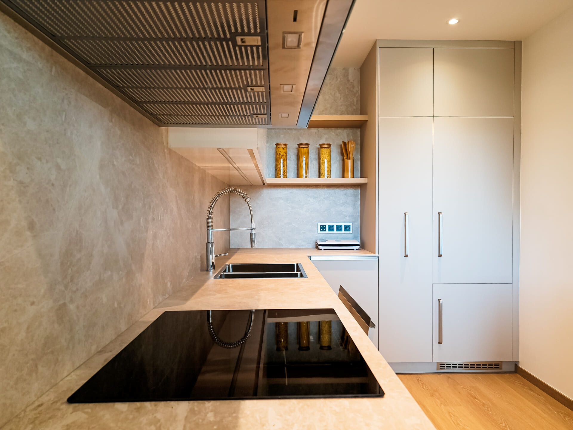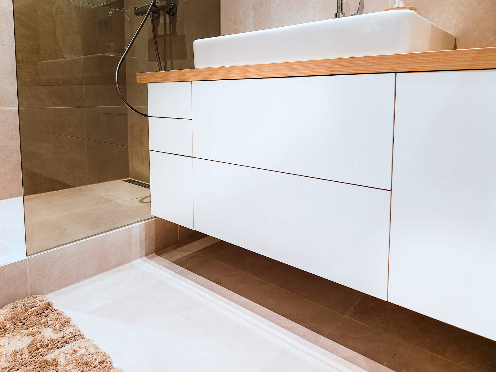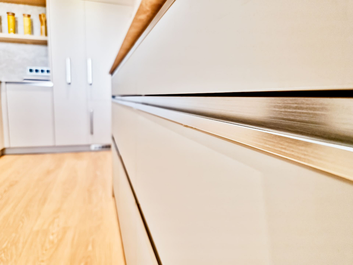 Pro tento byt v Komíně jsme zvolili moderní a elegantní design, ve kterém se snoubí nadčasová bílá barva s přírodními materiály. Otevřené police, které se nacházejí v kuchyni i dalších místnostech, pak dodávají celému prostoru vzdušnost a lehkost. Úložný prostor pak doplňují praktické skříňky rozličných tvarů a velikostí.