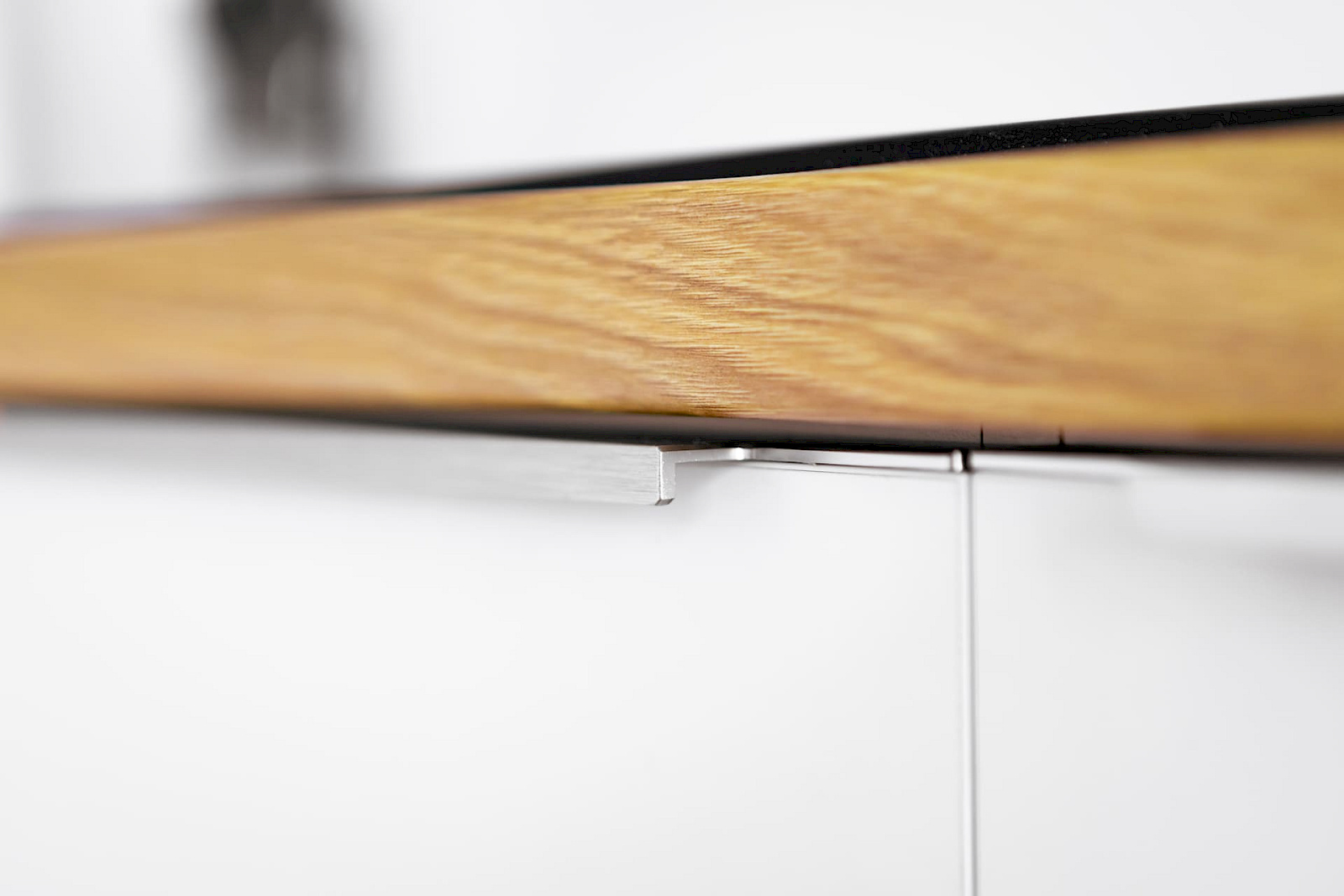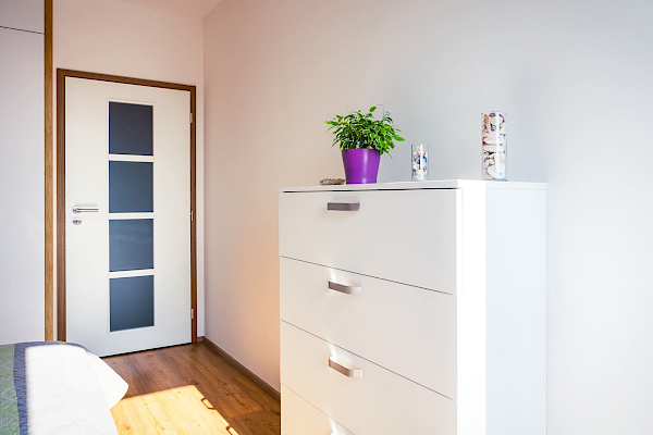 Pro byt v Roztokách jsme volili materiály tak, aby sjednocovaly jednotlivé místnosti a aby byt působil kompaktním a příjemným dojmem. Kuchyně v odstínu Perfect Matt Alpská bílá od firmy Egger slibuje odolnost vůči otiskům prstů a odpovídá představám majitele o praktickém řešení kuchyně. Pro ozvláštnění byla bílá doplněna také šedými dvířky a nerezovými úchytkami.