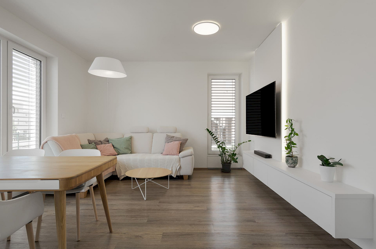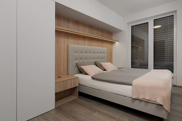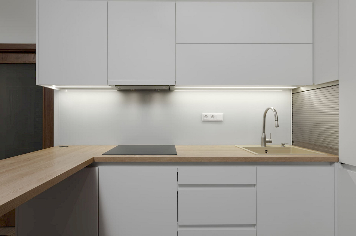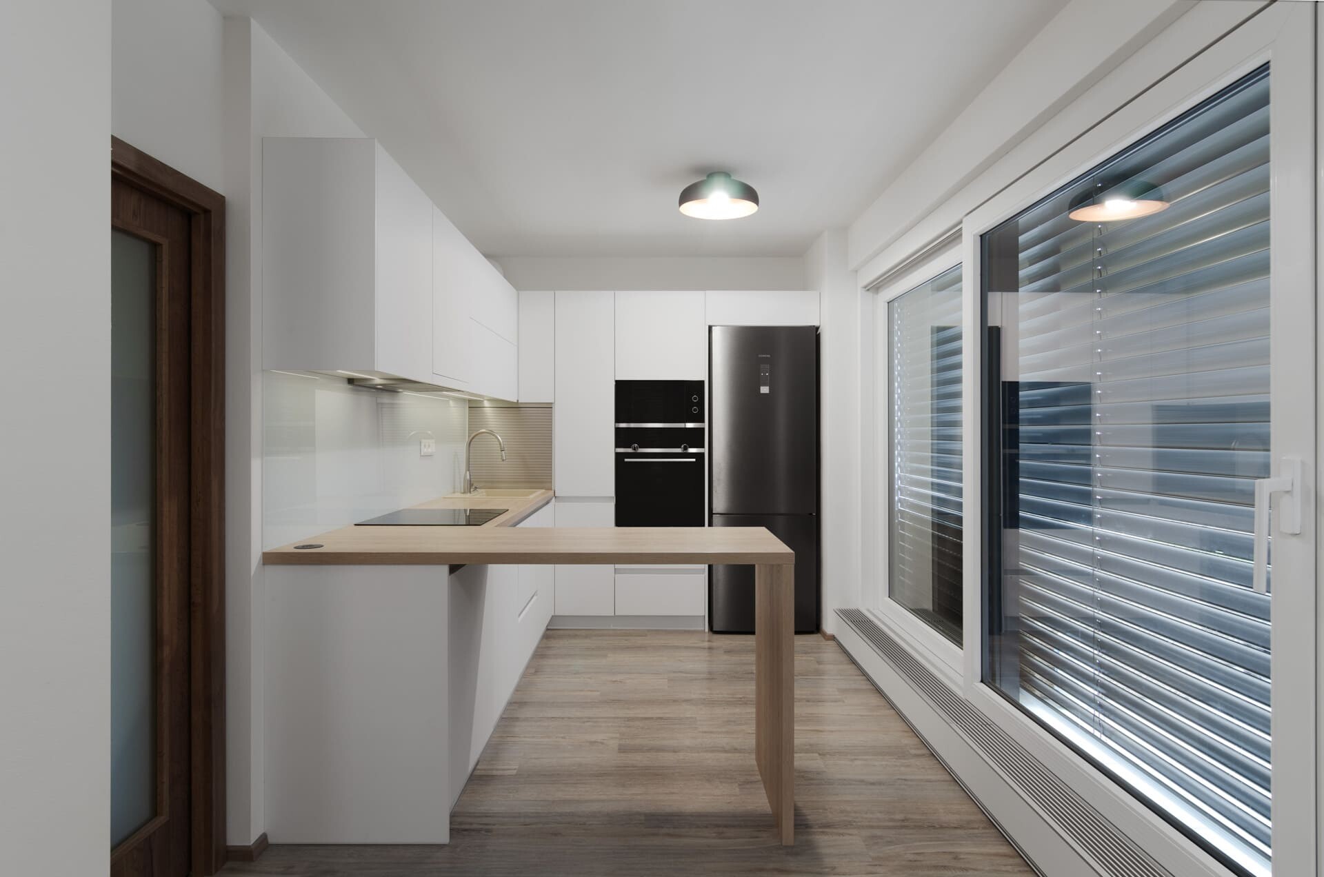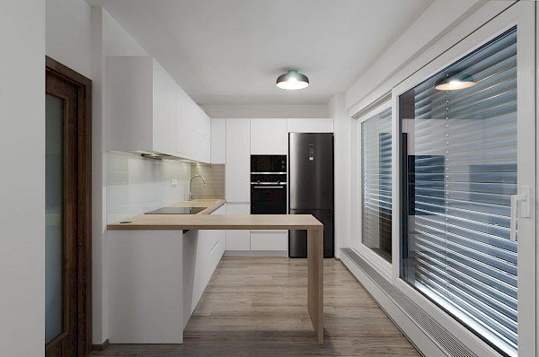 Rezidenční byt v nové výstavbě brněnské lokality Sadová pojal náš architekt v moderním stylu se zachováním tepla domova. Interiéru panují bílé ultramatné povrchy od firmy Egger bez odlesků Alpská bílá doplněné o dřevodekory. Kromě nadčasové kuchyně jsme v bytě realizovali také koupelnu, obývací stěnu s jemným podsvícením či nábytek na míru do ložnice. Chcete interiér na míru? Ozvěte se nám a společně to vymyslíme!