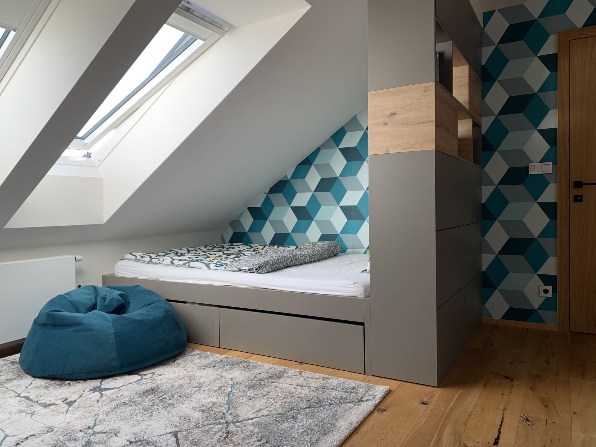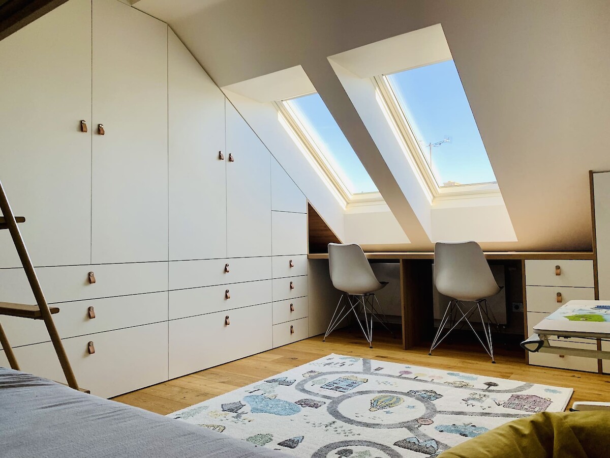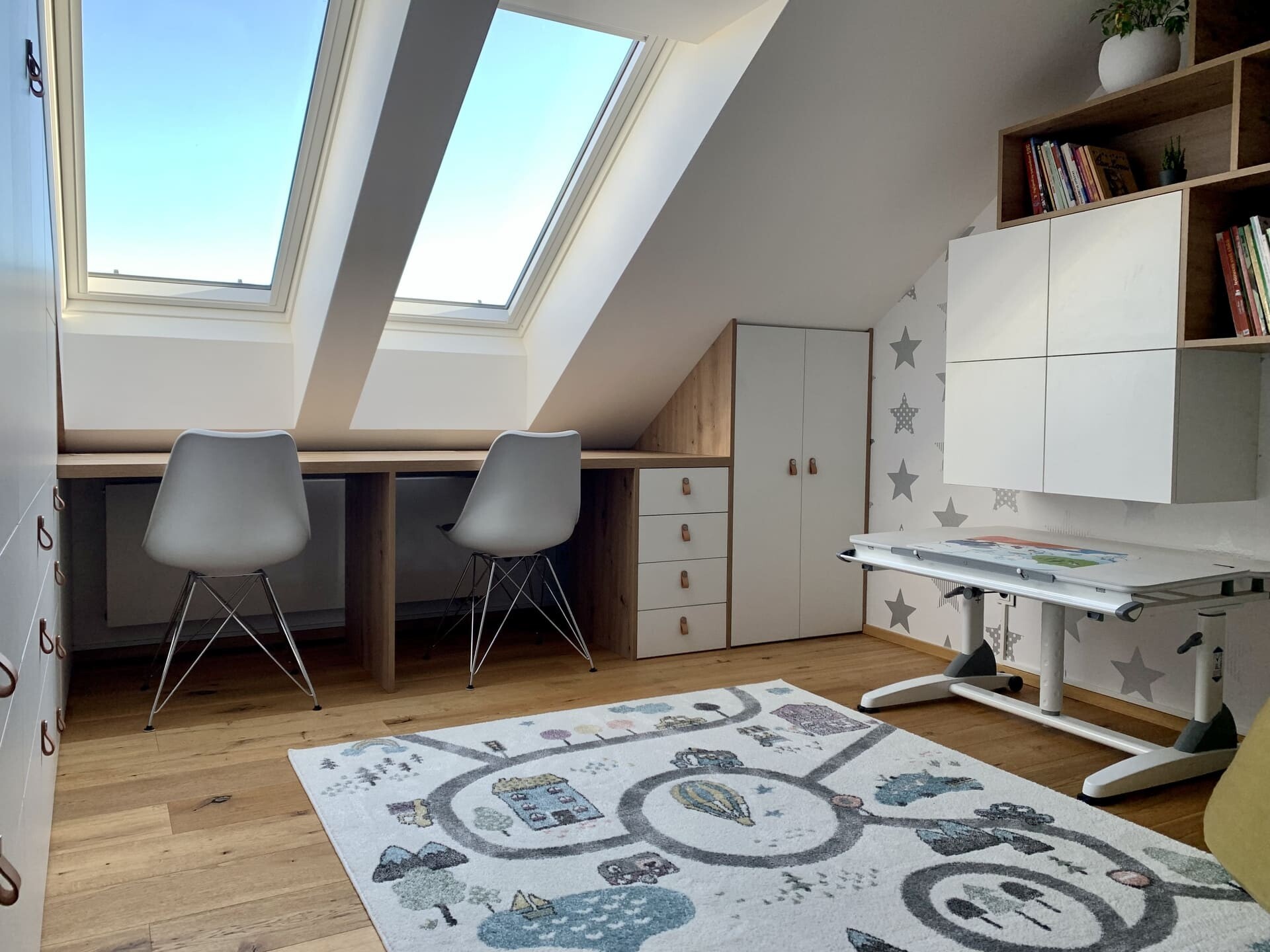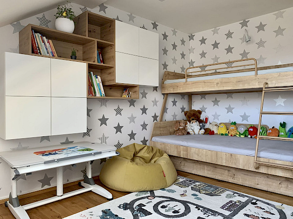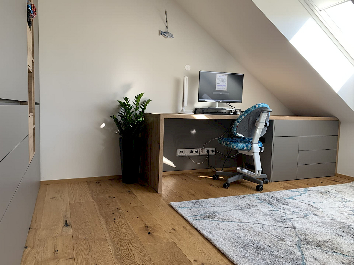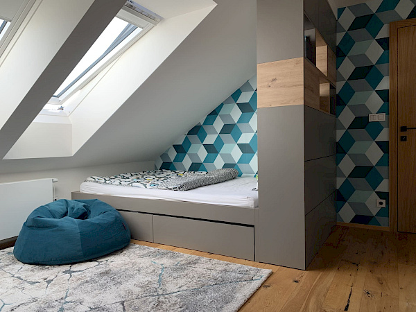 Pro mladou rozrůstající se rodinu jsme realizovali dva dětské, chlapecké pokojíčky. Podkrovní prostory většinou umožňují vymyšlení netradičních řešení interiéru a dobrým plánováním lze i v prostorově omezenějších podmínkách získat dostatek místa a úložných prostor. Zejména výroba nábytku na míru poskytuje možnosti realizovat skříně a stoly pod šikminou, jako tomu bylo i v tomto případě. Po konzultaci dispozic a návrhů s majitelkou byl jako základní materiál zvolen přírodní dub Hamilton, ke kterému krásně ladí kožené úchytky skříní. Barevně byl kombinován s bílými a šedými dvířky.
