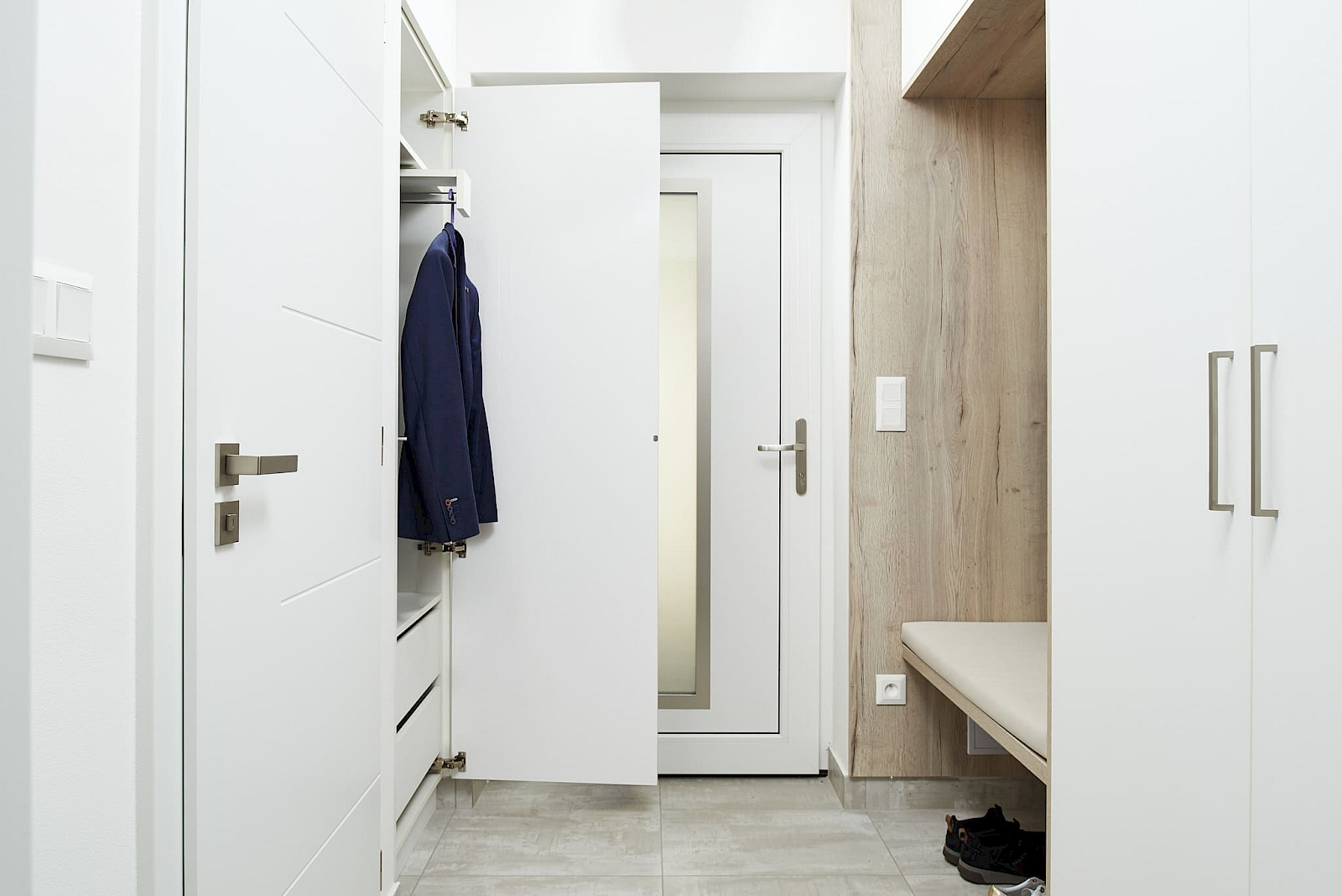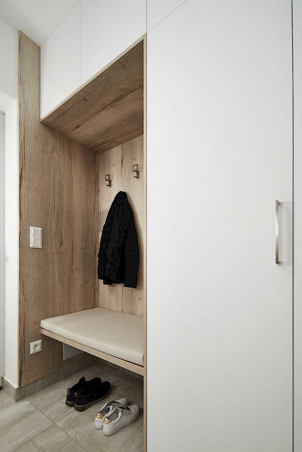 Velmi pohodlným a funkčním řešením může být kuchyňská linka v půdorysu písmene U. Toto navržení kuchyně poskytuje dostatek úložných prostor pro nádobí i spotřebiče a zároveň dostatek pracovní plochy pro jednoho i více lidí najednou. Díky svému rozvržení je v takové kuchyni vše po ruce a s výběrem správných dekorů je výsledný dojem velmi útulný. Pro kuchyň v Bučovicích jsme zvolili oblíbenou kombinaci Alpské bílé od firmy Egger a dřevodekoru, který je zde zastoupen bílým dubem Halifax z kolekce Feelwood. Jedná se o dekor, který krásně vyniká svou prořezávanou strukturou a působí dojmem opravdového dřeva. I proto byl tento dekor zvolen jako jednotící prvek celého bytového interiéru také pro nábytek v předsíni i ložnici, které panuje krásná podsvětlená postel s pohybovým čidlem.