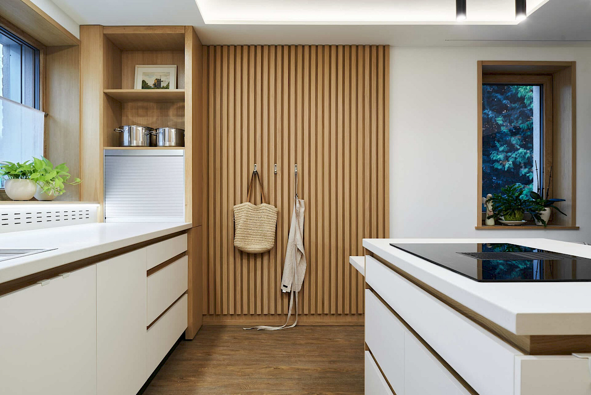 V tomto domě jsme se chopili realizace kuchyně, jídelny, obývacího pokoje i koupelny. Použili jsme elegantní a nadčasovou kombinaci bílé barvy s přírodními materiály. Mysleli jsme ale i na praktickou stránku bydlení, a proto jsme do jednotlivých místností zařadili dostatek úložných prostor. Prohlédněte si naši práci – a pokud vás zaujme, neváhejte nás kontaktovat.