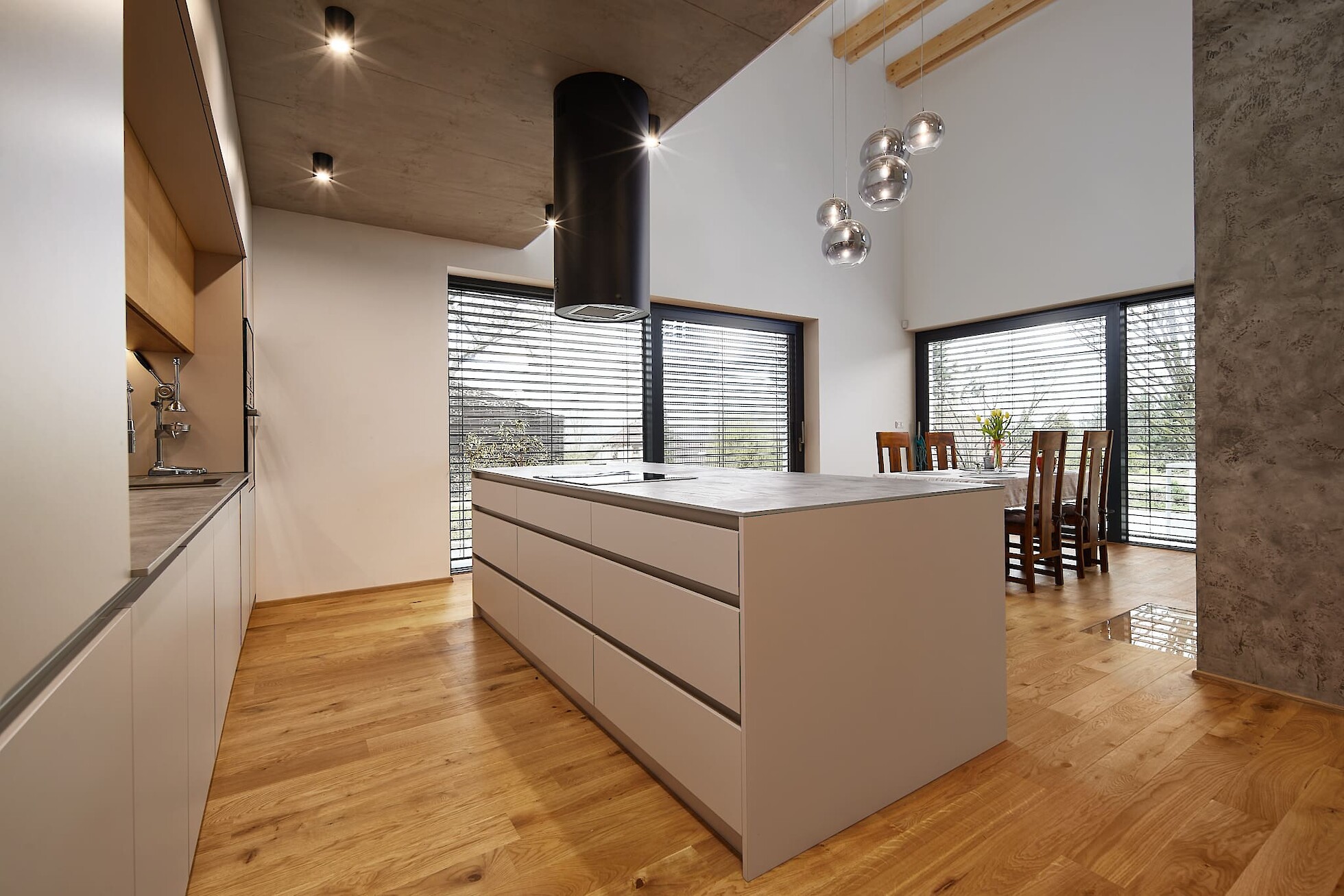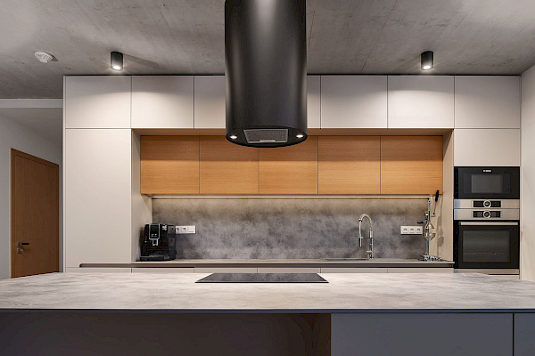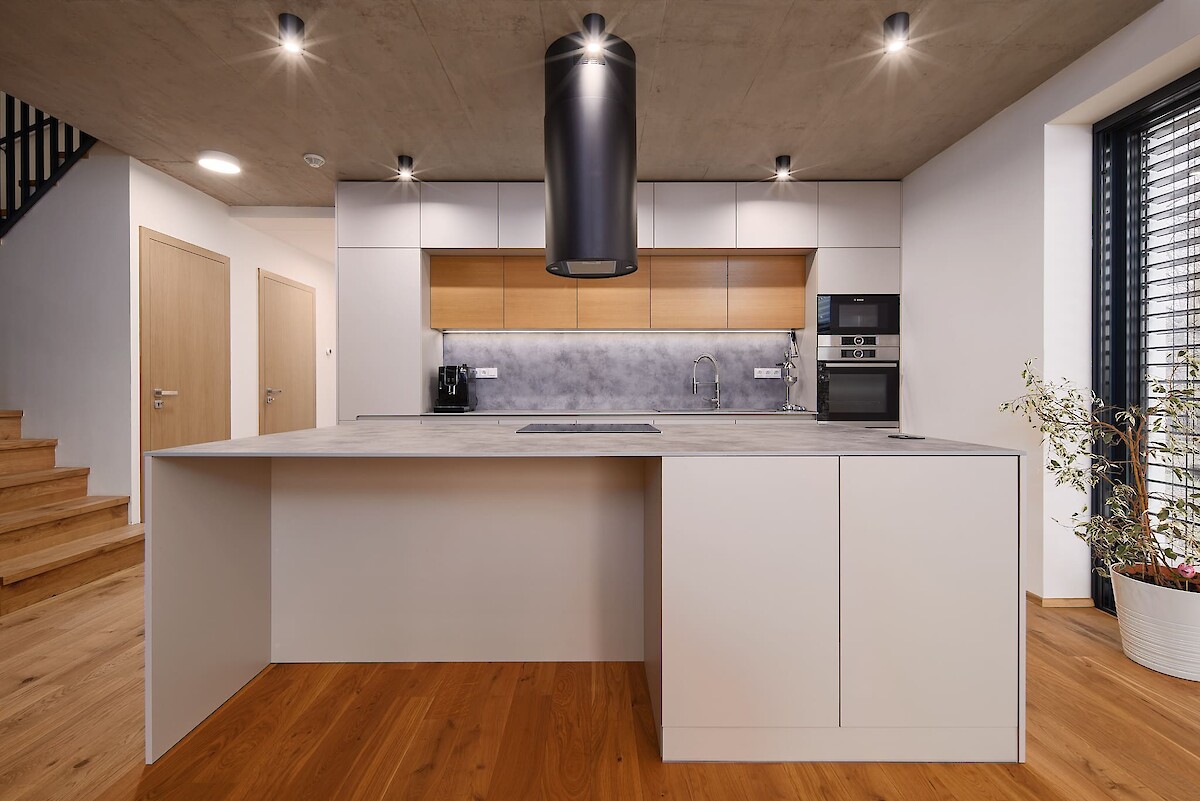 Realizaci tohoto rodinného domu jsme pojali moderně a minimalisticky. Čistý a jednoduchý design působivě propojuje industriální šedou s bílou barvou a dřevem. Elegantní a praktické řešení kuchyně, obývacího prostoru, ale i koupelny a ložnice.